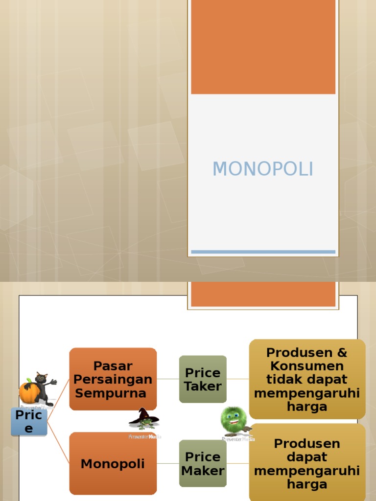 Ppt. Pasar Monopoli (Jonathan Jensen) Monos berarti sendiri, sedangkan polein berarti penjual, seperti dikutip dari Edisi Belajar Teori Ekonomi (Pendekatan Mikro) Berbasi. Pasar monopoli adalah suatu keadaan di mana sebuah perusahaan mendominasi dan memegang kendali penuh atas produk tertentu. Pada jenis pasar ini produsen baru yang masuk ke pasar umumnya tidak dapat menyaingi produsen lama.